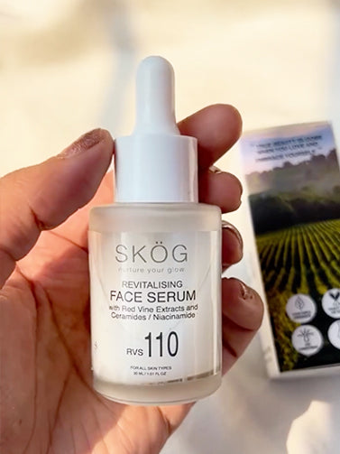 Apply a few drops of Revitalising Face Serum during day and before bed and massage gently into your face and neck. Let is sit for a few minutes before completing your routine with Skög Cloudberry Hydrating Cream.